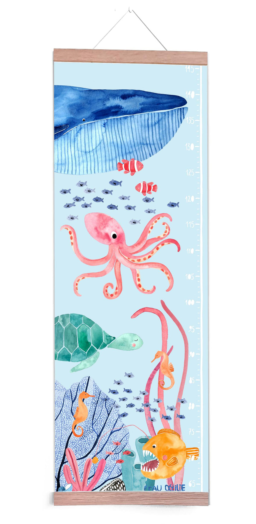 Unsere Messlatte für Kinder als Poster fürs Kinderzimmer mit vielen Tieren aus der Unterwasserwelt. Zusammen mit Schildkröte, Wal, Oktopus, Seepferdchen und Fischen macht das Wachsen Freude.